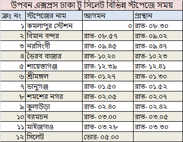 উপবন এক্সপ্রেস ঢাকা টু সিলেট বিভিন্ন স্টপেজের সময়সূচী